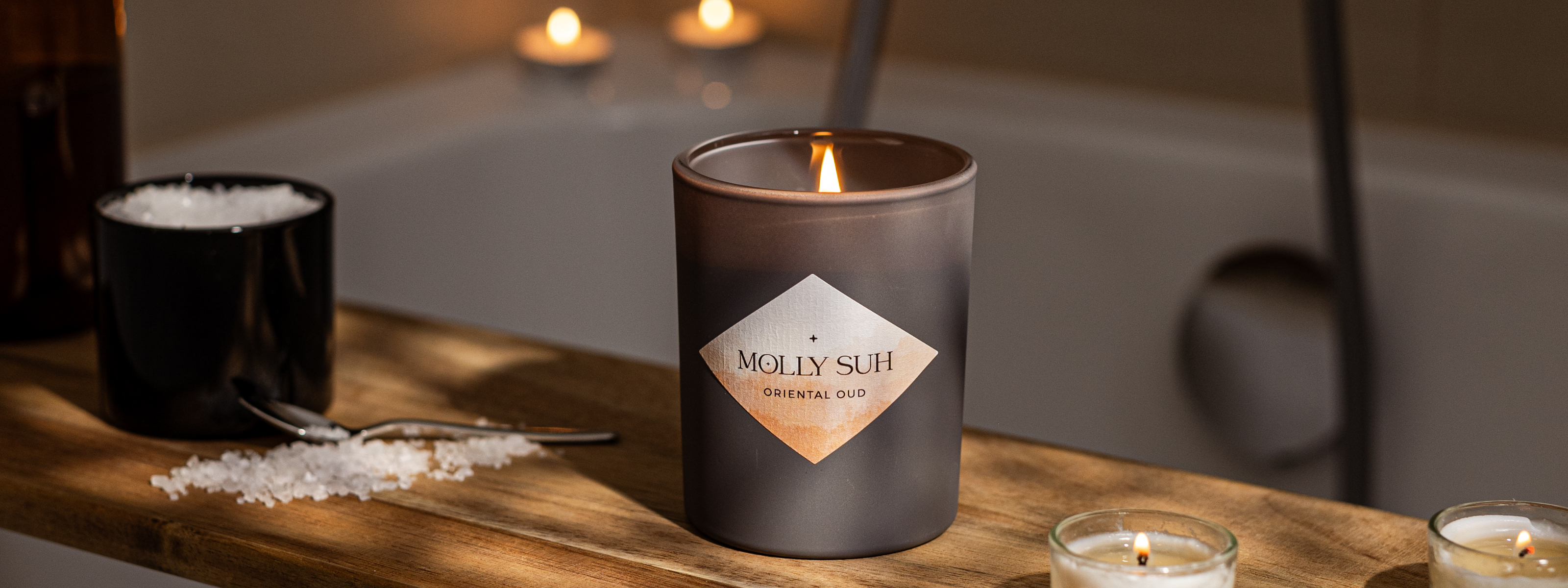 Kerzen spenden romantisches Licht und angenehme Wärme und sollten in keinem Zuhause fehlen. Dabei haben unsere Kerzen einen Vorteil: Sie verströmen neben Licht und Wärme einen herrlichen Duft, der jeden Raum zur Wohlfühloase macht. Denn die MOLLY SUH Kerzen sind mit feinsten Duftölen veredelt – angenehm sanft und unaufdringlich. Probiere es selbst! Oriental Oud besticht mit einem Hauch aus Oud (Adlerholzbaum) und Zedernholz, Cozy Vanilla durch den Duft schwarzer Vanille, Holy Hamam bringt dich in andere Sphären – dank der Aromen von Eukalyptus und Zitrusfrüchten, Magic Sandalwood verzaubert dich mit Sandelholz und Iris, während Sunkissed Cherry mit dem Duft von feinen Kirschblüten, Kirschen und Pfingstrosen dich fröhlich stimmt.